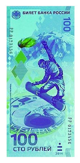 俄罗斯央行10月30日发行,俄罗斯索契冬奥会纪念钞,该纪念钞的面额为100卢布(约合3.30美元)。这是俄罗斯自苏联解体后首次发行纪念性纸币,此前只有中国专门为奥运会发行过纪念钞。发行量1000万张。