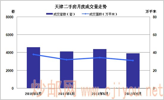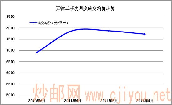 2011年6月,天津二手房市场销售3928套,签约成交面积为31.1484万平方米,环比上月下降了10.08%。天津二手房销售均价7724 元/平方米,环比下降了1.76%。