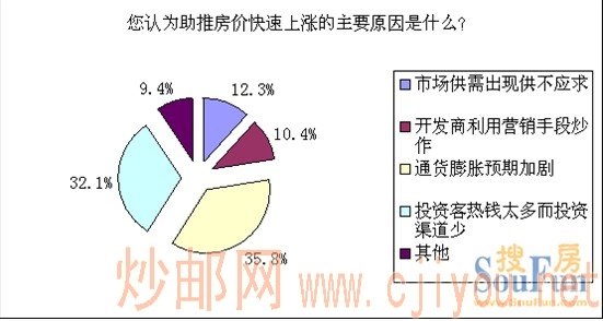 上海搜房网最新调查显示:35.8%的网友认为助推房价快速上涨的最大原因是“通货膨胀预期加剧”,32.1%网友认为“投资客热钱太多而投资渠道少”是主因。还有小部分网友认为市场供不应求、开发商利用营销手段炒作是推动房价上涨的原因。