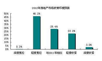调查数据显示,46.2%的受访者认为2012年的政策环境会比去年略有宽松,28.4%的人认为今年的调控力度会与去年相似,还有25.2%的人员认为调控力度会继续收紧。