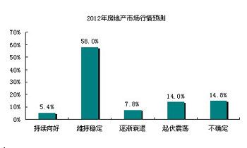 调查数据显示,58%的房地产业内人士认为2012年的市场行情将会保持稳定,只有5.4%的人认为今年的房地产市场会逐渐向好;此外,还有14.8%的受访者认为今年的市场走势尚存在较多不确定性。