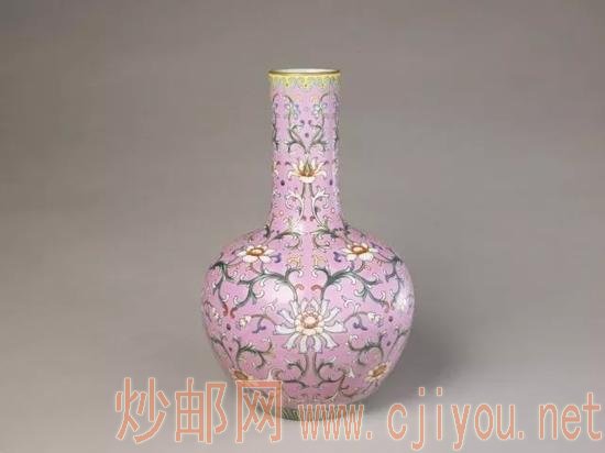 乾隆朝除了白地绘粉彩外,还有色地粉彩或色地开光中绘粉彩等品种。乾隆朝粉彩的创新品种是在黄、绿、红、粉、蓝等色地上用极细的工具轧出缠枝忍冬或缠枝蔓草等延绵不断的纹饰,且多和开光一起使用,人称轧道开光。这一工艺的出现,将粉彩推上了更加富丽繁缛的顶峰,一直延续到民国。