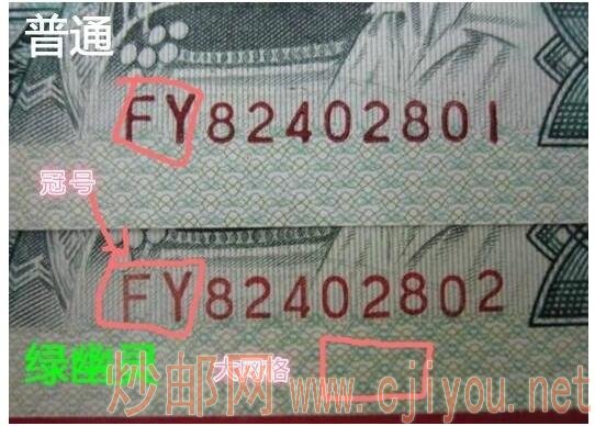 2元绿幽灵的特点:一、必须要有蛇皮纹的效果;二、背面的“2”必须是绿色;三、票面的花朵比较明亮,有荧光的效果。