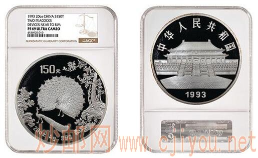 另一大尺寸的亮点藏品是一枚1993年的150元20盎司孔雀开屏连边版银币,评级为NGC PF 69 Ultra Cameo。这是经NGC认证的第二枚该珍稀品种钱币。