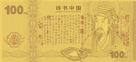 “珍藏册里面的《诗书中国主题纪念钞》和邮册设计同样吸引我。”李女士说。“金钞0.1克,正面是王羲之人物像和《兰亭序》,背面是《幽居图卷》,还有炫彩、防伪工艺,很精致。”据李女士介绍。