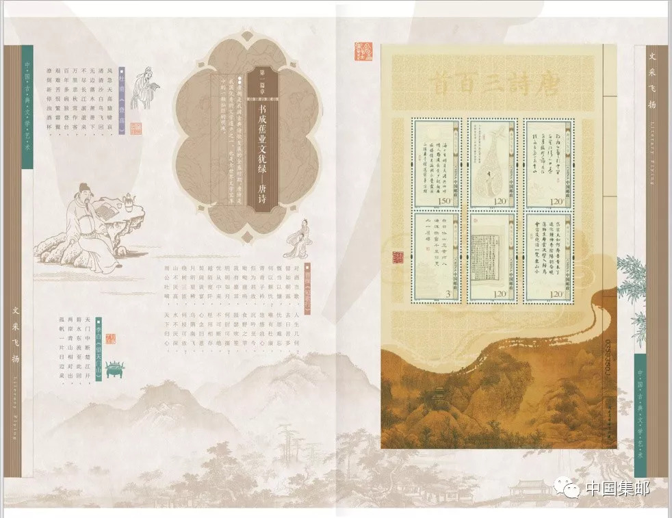 在经历了两汉魏晋南北朝的长年发展,中国诗歌史进入了黄金时代——唐代。唐诗上承汉魏风骨,力扫齐梁宫体颓靡诗风,焕发出清新健康的歌唱。其诗体完备,流派各异,名家辈出,成就卓著,佳句妙语至今仍广为流传。《唐诗三百首》特种邮票也是中国邮政发行的古代诗词系列邮票的第一款。