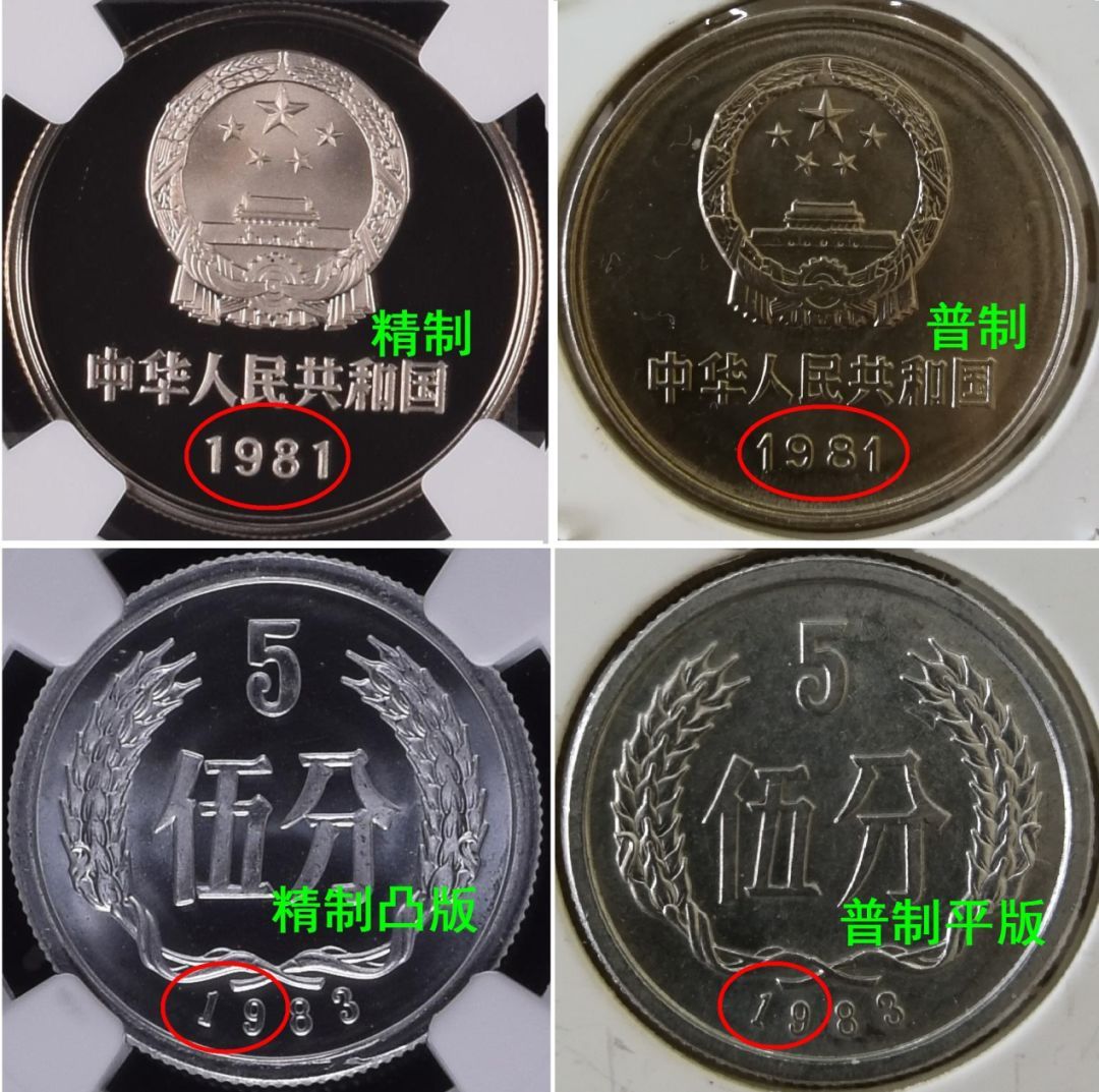 既有精制又有普制的,包括:81元角分、83元角分、85分币、8501、8505、851宽版、86分币、91~00元角分。但同年同面值的浮雕未必相同。如811、83-5,如图4所示。