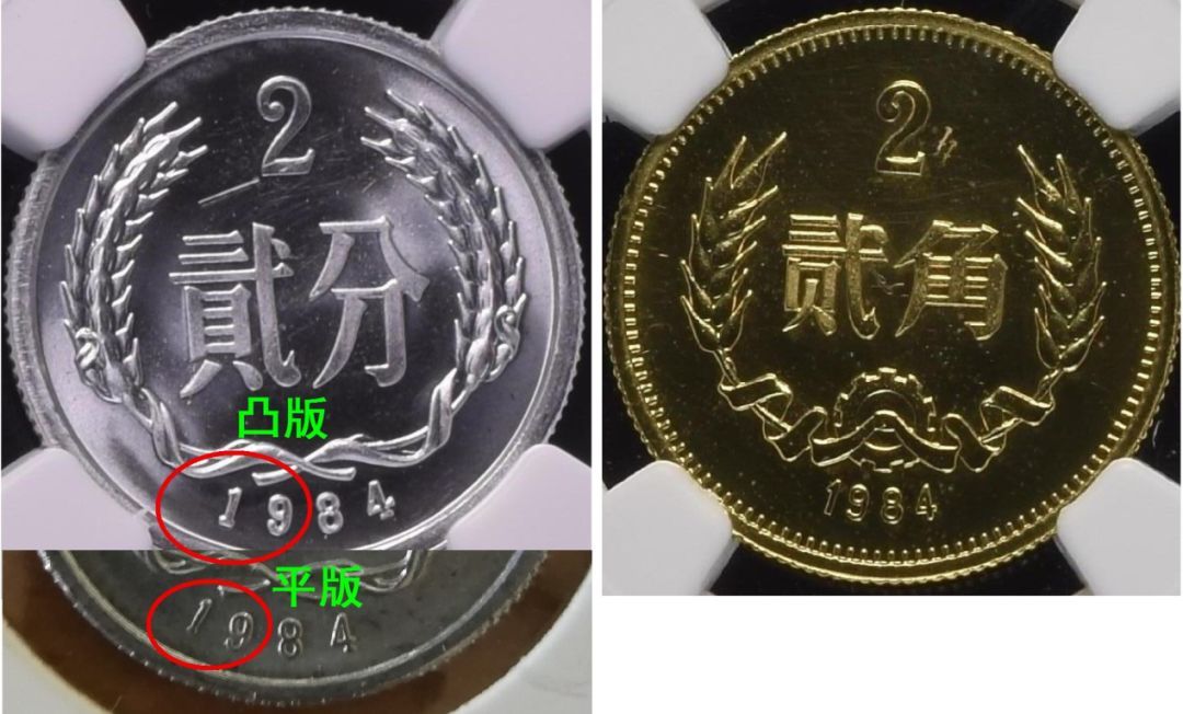 图5 凸版84-2和上海版8402发行量相同(一说约3000枚),凸版1和9的距离比平版更宽(凸版84-2与上海8402来自NGC,平版为笔者藏品实拍)