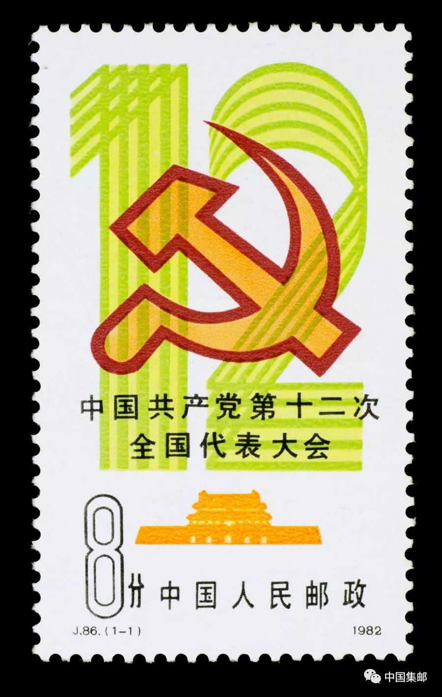 发行于1982年的“J.86 中国共产党第十二次全国代表大会”纪念邮票,画面由党徽、天安门和数字“12”组成,构图简洁。嫩绿色的线条组成的数字“12”不仅富有生命力,也意味着玉宇澄清。