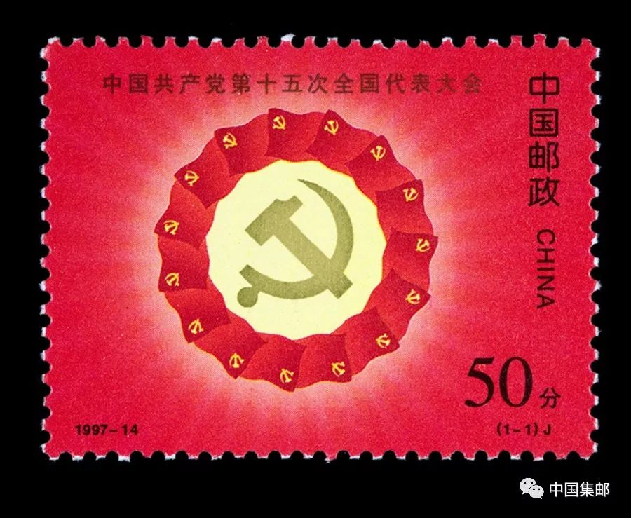而在“1997-14 中国共产党第十五次全国代表大会”中,设计者则是用围绕在党徽周围的15面党旗,烘托出了“十五大”的含义。
