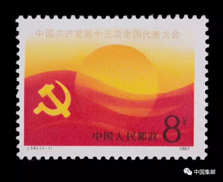 “J.143 中国共产党第十三次全国代表大会”则展现了一幅旭日初升的画面,表达了中国共产党领导下的改革开放事业蒸蒸日上,欣欣向荣。