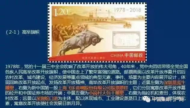 今年是改革开放40周年,称之为“中国的第二次革命”。所以小型张使用了天安门图案。40年来,从农村到城市、从经济领域到其他各个领域,全面改革的进程波澜壮阔,成就非凡。邮票作为“国家名片”,自然真切地反映了40年来我国的发展变化。今天我们就和小小邮票一起,讲述改革开放故事。