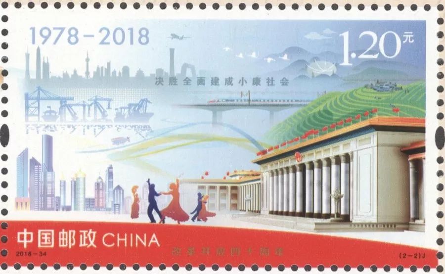 “伟大实践”邮票画面选取人民大会堂、复兴号列车、C919大型客机、“精准扶贫”后的美丽乡村等,辅以现代化的港口和城市建筑剪影等元素设计而成,票面上的文字为“决胜全面建成小康社会”,寓意改革开放40年,党和国家各项事业取得举世瞩目的伟大成就,全国人民在改革开放伟大实践进程中共享繁荣发展的幸福和喜悦。