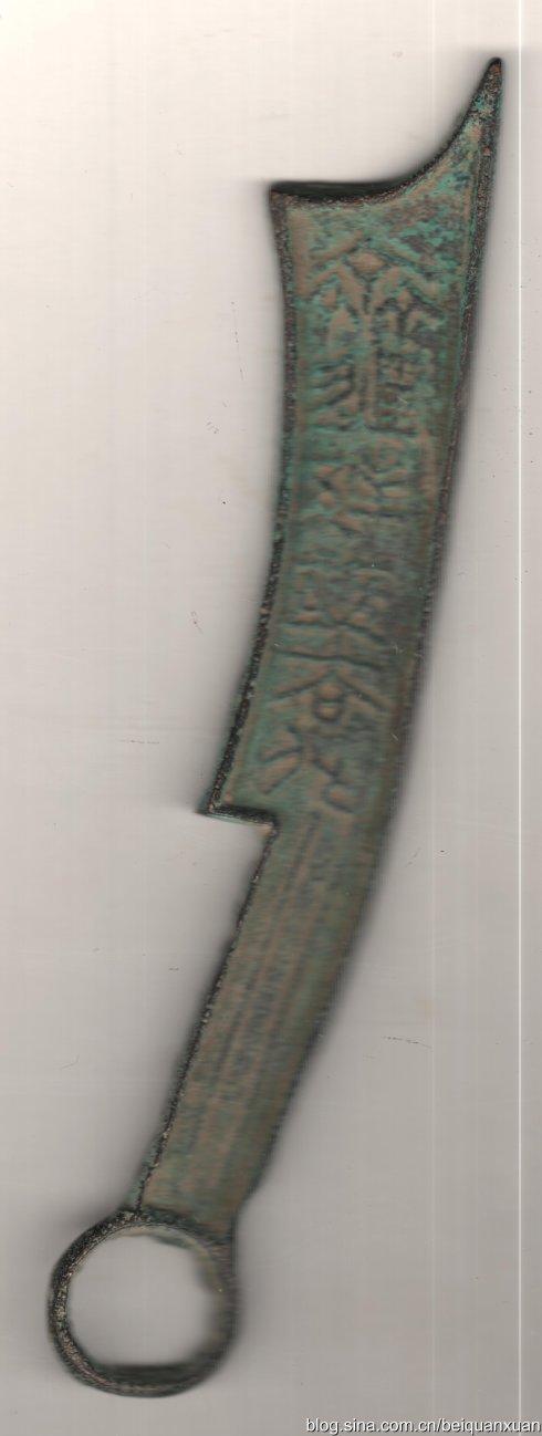 中型漆金六字刀。金文。齐造邦长法化。战国齐铸。背四道横纹,加十字。或纪值。