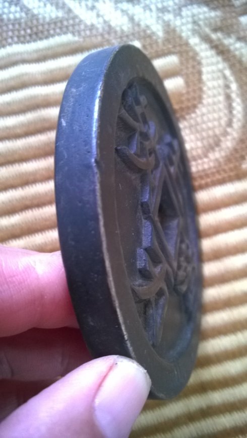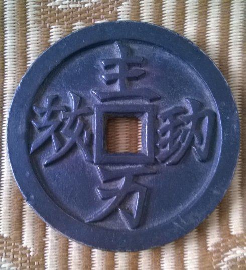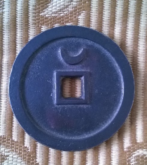 笔者本次所展是一品《皇帝万岁》银质大钱,钱铸制异常精整,方正圆矩,平坦地章,穿轮干净,面文顺时针方向旋读,钱文书法端庄隽秀,笔力雄劲,钱背穿上有一规整的仰月纹。该钱通体黑漆古包浆,黑中泛亮。叩击其声清脆,不同凡响,掂之沉重之感不同寻常。该钱直径95mm,穿孔17mm,厚8.8mm,重351g。