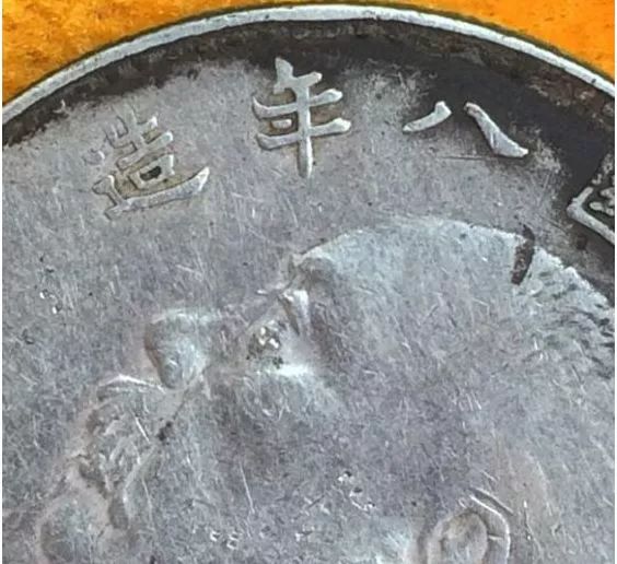 高仿银元通常是用真銀元来“克隆”模具,如果选用的不是原光币而是流通过旧币做样板,一般总是会有磨损,不如新币那样精,这点就在仿造币的字体、图纹上出现“非自然磨损的磨损”(不是币本身的磨损,而是模具磨损)的共性特征,在放大镜下必露马脚。