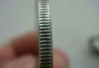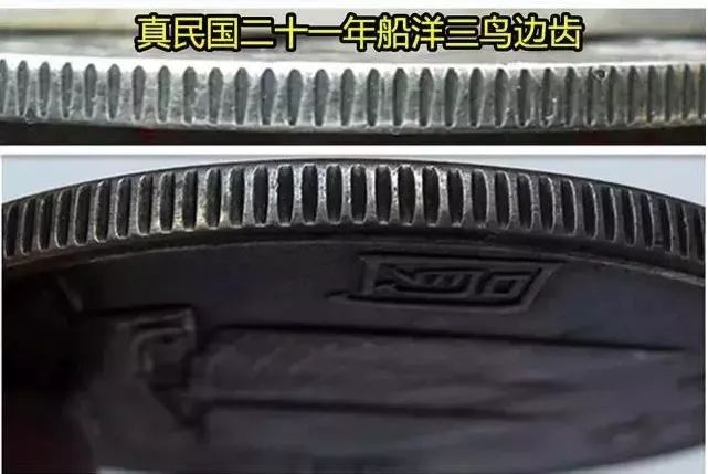 真银元的边齿是专制的滚边工艺制成的,规范精致,而高仿银元多数的边齿是压制或用铣床,微型铇等设备铣、铇出来的,通常会有不规则或产生高于币面的流银,再经打磨则会在边缘留下规则的非自然磨损痕迹。也曾发现有用先进的边齿加工机制作的,但精细的边齿工艺模具与原始齿形也会暴露出仿币的面目。