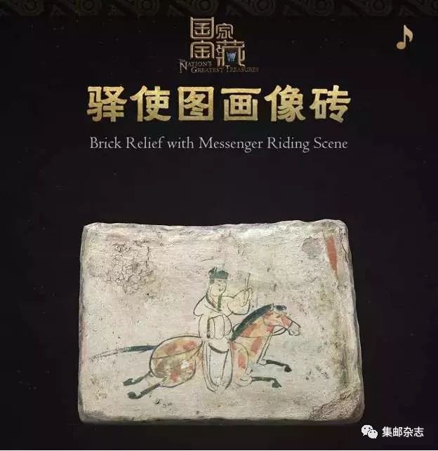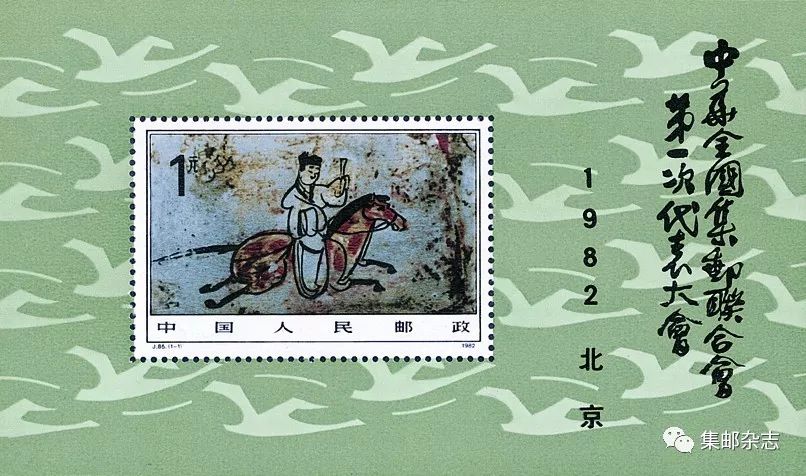 1982年中国邮政为纪念中华全国集邮联合会第一次代表大会的召开发行纪念邮票小型张一枚,这枚邮票小型张的主图是于1972年在甘肃嘉峪关魏晋墓葬中出土的驿使图画像砖。
