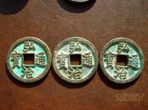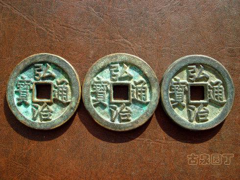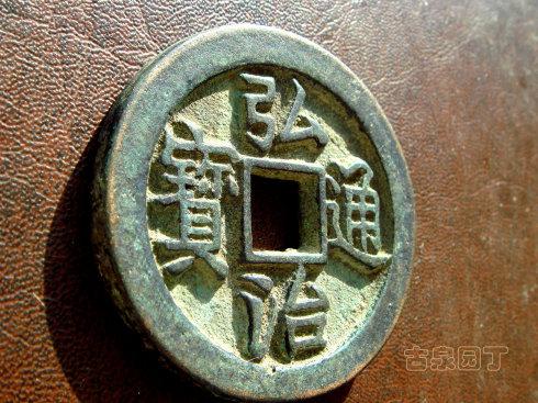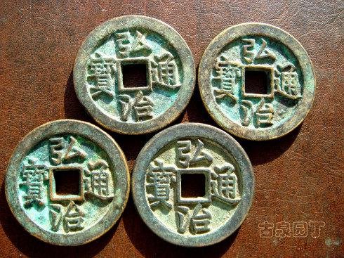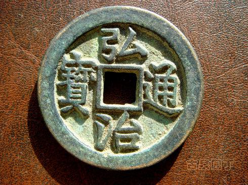 明孝宗朱祐樘,弘治十六年,两京及各省钱局开铸“弘治通宝”钱,定制每文重一钱二分,并规定了每年的铸额弘治十八年五月,帝下令户部调查各地铸造“弘治通宝”的情况,各地所铸仅为计划的十分之一、二;到了正德二年,四月下令各省全部停铸。前后铸期不足四年。版式为小平钱,光背。有大字光背版式,比较少见,传世品有一枚当十大钱,可能是试铸样钱。弘治通宝存世量较其他明代钱币为少,制作不精,文字粗拙。