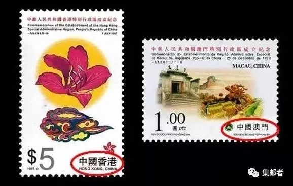 香港、澳门回归后,发行邮票均用“中国香港”和“HONG KONG,CHINA”、“中国澳门”和“MACAU,CHINA”铭记。
