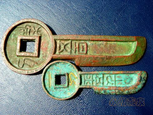第二次改革:又造契刀、金错刀。 契刀,其环如大钱,身形如刀,长二寸,文曰‘契刀五百’。错刀,以黄金错其文,曰‘一刀直五千’。与五铢钱凡四品,并行。”王莽摄政时期,托古改制,为应对物价上涨、通货膨胀,制造了契刀五百,一刀平五千这样的大额货币。可以看出,西汉末年,经济凋敝通货膨胀,铸造大额钱币才能保证市场流通需要。这时,还没有废黜五铢钱。