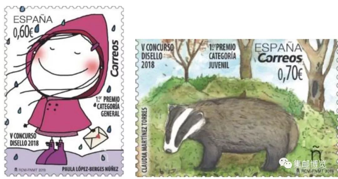 2019年2月5日,西班牙邮政发行一套两枚邮票,将2018年西班牙邮政主办的全国邮票设计大赛获奖作品搬上方寸。邮票设计大赛已举办五届,2018年有1713位艺术家参赛,其中青年组(12至17岁)提交945件作品,成年组(18岁以上)提交768件作品。专家评审组评选出每组前20名,再加上大众评选出的每组前20名,最后从这80件作品中脱颖而出的是:成年组的Paula López、青年组的Claudia Torres Martínez。