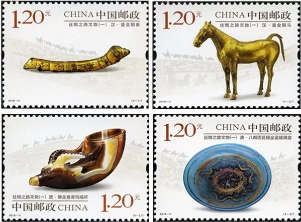 2018年5月19日,中国邮政发行的《丝绸之路文物(一)》特种邮票一套4枚,邮票图案选取陆上丝路起点陕西省出土的四件代表性文物:“汉•鎏金铜蚕”、“汉•鎏金铜马”、“唐•镶金兽首玛瑙杯”和“唐•八瓣团花描金蓝琉璃盘”。该套邮票所展现的文物,见证了古丝绸之路的繁荣和源远流长。