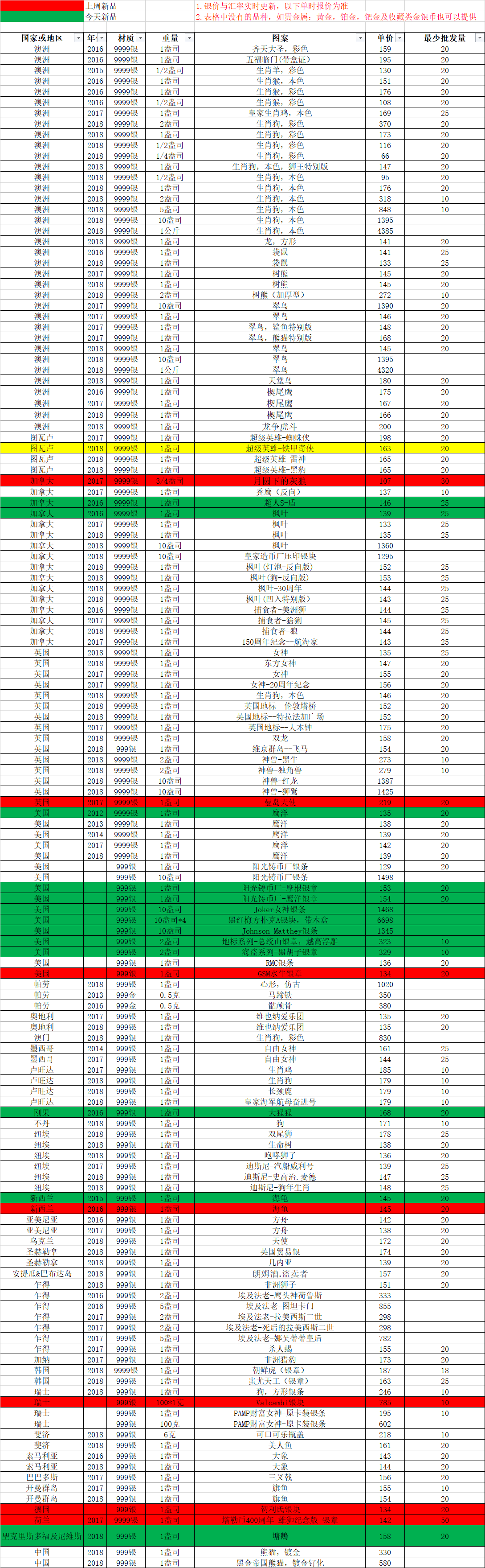 如果以下表格上没有的品种,可以电话,微信联系。市面上常有的国外金银币品种都可以提供!