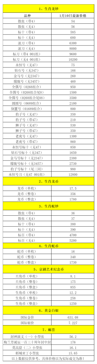 小龙钞、龙币、京剧币、东北虎豹币1月10日行情