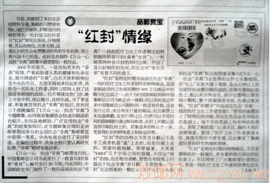 日前,我接到了来自北京的特快专递,集邮的习惯使我细心的打开邮件,护邮袋的邮折内一枚封装完好的首日“红封”展现在面前,仔细观察,其品相绝佳、完美无瑕,这是红封研究会免费赠送给我的牛年礼物,更让我兴奋不已的是,此封是我制作《战胜非典》邮集中最需要的一枚珍品。