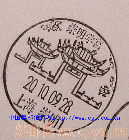 上海市崇明县邮政局于2010年9月28日为配合《孔庙、孔府、孔林》特种邮票的发行,启用“崇明学宫”风景邮戳,该戳直径30mm,钢质,可换字钉。戳图设计者:马金宇。戳图上半圈文字为“崇明学宫”,中间为学宫棂星门前,东西两座石牌坊和古银杏树的枝叶,戳下半圈文字为20.10.9.28.和“上海 崇明 1”,该风景日戳共刻制二枚,现使用的为1号戳,2号戳未启用。