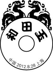 为配合中国邮政于2012年8月28日《和田玉》特种邮票的发行,同名邮戳于同日和邮迷见面。这枚邮戳设计手法简洁明了,以劲挺的细线大圆套小圆,形成玉璧的主体,并附上“和田玉、2012.8.28. 上海”字样作点题。又以粗重的线条构勒出一对称的独角兽,雄踞于玉璧上方,形成黑与白、粗与细的强烈对比,使人联想起玉的温润美丽,端庄大气。这两枚邮戳由上海市集邮总公司贾寅设计。