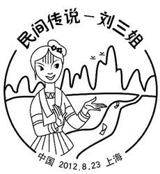 中国邮政于2012年8月23日发行《民间传说――刘三姐》特种邮票一套,由上海市集邮总公司推出的同名邮戳同日面世。这枚以民间传说――刘三姐、中国 2012.8.23上海字样,及弧线构成圆形邮戳,又以桂林地区特有的连绵远山为背景,一条漓江蜿蜒而来。设计者以卡通人物手法简洁地刻画出“歌仙”刘三姐的形象,那灵动的大眼,舞动的双手,把刘三姐的聪明美丽、能歌善唱,表现得生动传神,入木三分。