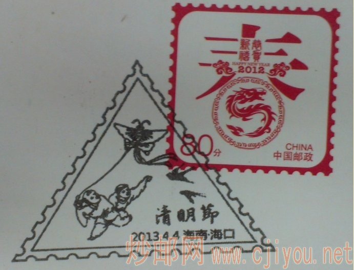 海南海口清明节发行一枚三角形纪念邮戳 日期:2013-04-12 上图为今年清明节纪念邮戳,形制等边三角形,边长40mm,靠左边和上边是一个孩童在放风筝,右侧是两只飞翔的家燕,右下角写有“清明节”,底下是“2013.4.4”和“海南海口”字样。
