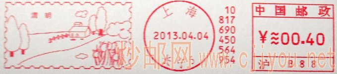 2013年4月4日是中国传统节日“清明节”,清明作为节日,在我国广大地区有进行祭祖、踏青、放风筝、插柳等一系列活动。当日上海市启用多枚清明节邮资机符志,其中包括在上海市西的北新泾、仙霞路、天山、新华路、长宁、静安、曹家渡、静安电信、石门二路等九邮局启用的二十四节气系列“清明”邮资机戳;上海市区的长宁、徐汇、仙霞路、静安、普陀、黄埔、杨浦7个邮局“中国非物质文化遗产之系列——清明节”邮资机戳;以及在世博邮局启用的重大节日系列“清明节”邮资机戳,世博邮局启用的邮资机戳分为有框和无框两种。