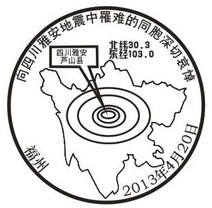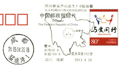 北京时间2013年4月20日8时02分四川省雅安市芦山县(北纬30.3,东经103.0)发生7.0级地震。震源深度13公里。据雅安市政府应急办通报,震中芦山县龙门乡99%以上房屋垮塌,卫生院、住院部停止工作,停水停电。目前已造成186人死亡,另据消息称,雅安芦山地震将受伤人数已突破10000人。中国人民心连心,一方有难八方支援,全国人民与雅安人民站在一起。各地邮政也纷纷推出雅安地震邮戳。以下为四川成都、河南洛阳、湖北武汉、福建福州邮政的雅安地震邮戳。