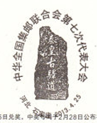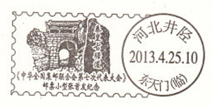 4月25日,中国邮政发行《中华全国集邮联合会第七次代表大会》纪念邮票小型张,小型张背景图案反映的是河北石家庄井陉秦皇古驿道。石家庄市邮票特别于邮票北京原地举行邮票首发式,并刻制了秦皇古驿道风景戳、“东天门”临时连体戳以及两枚首发纪念戳上图。