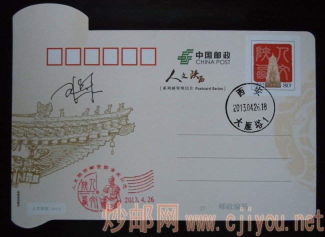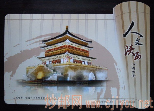 人文陕西专用邮资图普通邮资明信片欣赏 日期:2013-04-27 来源:我爱集邮 人文陕西专用邮资图明信片 人文陕西专用邮资图明信片 人文陕西专用邮资图 首发纪念邮戳 中国邮政于4月26日发行《人文陕西》普通邮资明信片一枚,主图为大雁塔和兵马俑。陕西西安举办“人文陕西”系列邮政明信片专用邮资图首发仪式,并启用邮资图首发纪念戳一枚。