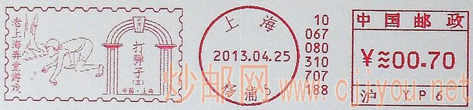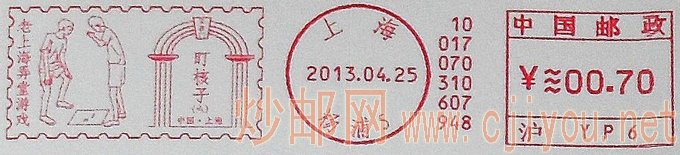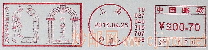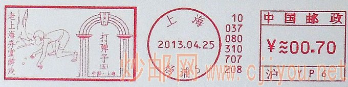 上海邮政推出“老上海弄堂游戏”系列必能宝邮资机戳,此前于1月25日、2月25日分别推出“老上海弄堂游戏 掼结子”、“老上海弄堂游戏 滚轮子”两枚邮资机符志,4月25日上海邮政同时推出两枚此系列邮资机符志,表现内容分别为“打弹子”、“盯核子”,各有花边和直线两种花色。