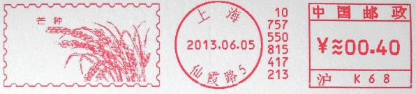 2013年6月5日是我国24节气“芒种”。上海邮政特在市西9邮局启用“芒种”邮资机符志一枚。