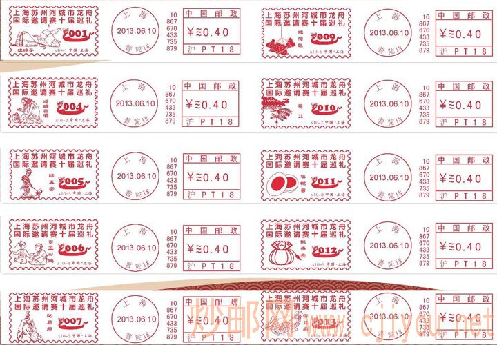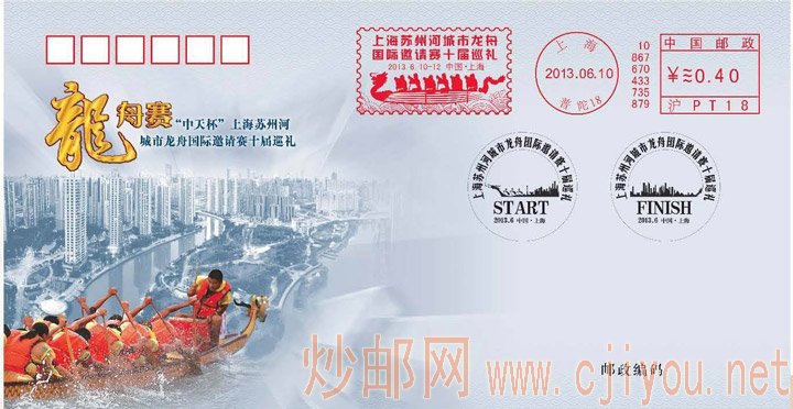 上海市邮政公司普陀邮政支局为此就十届龙舟赛题材量身定做邮资机宣传戳一套十枚,从不同角度回顾赛事盛况,解读传统端午文化,制作了戳折、封折、邮折等系列专项产品,赛事期间开始在普陀区内各邮政网点限量销售,以配合龙舟赛活动的开展。这些邮品不仅对苏州河城市龙舟赛十届历程深刻巡礼,更将龙舟传统文化与集邮文化完美结合,为推动集邮文化普及,陶冶市民情操,提升市民文化修养提供了良好的媒介。此外,活动当天还将启用DM300必能宝邮资机宣传戳符志一枚,比赛现场中潭路99弄除销售系列产品及龙舟赛纪念封外,还将在起点、终点限时提供盖戳服务。