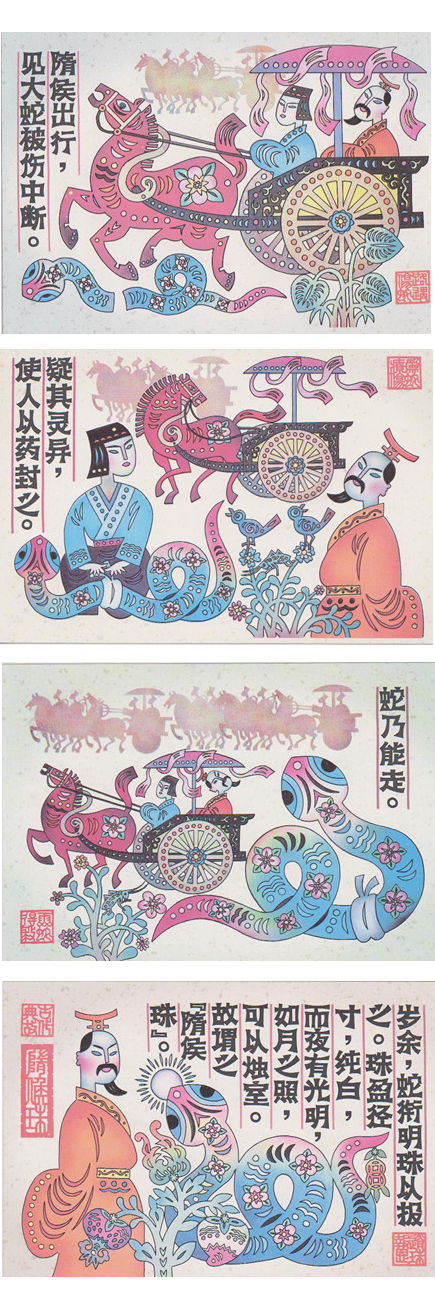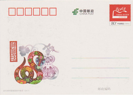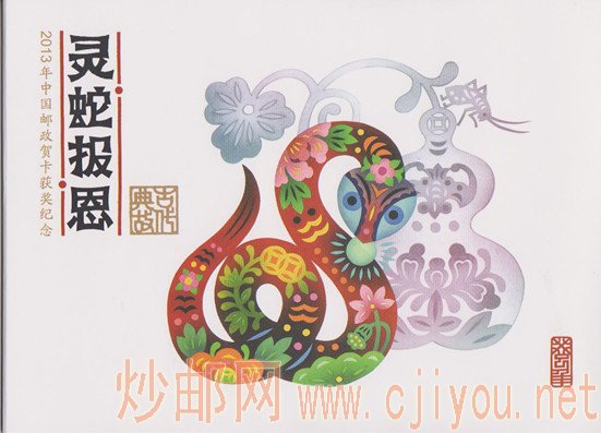 2013年中国邮政贺卡获奖纪念《灵蛇报恩》邮资明信片一套4枚。分别是:《隋候珠》;《蛇乃能走》;《疑其灵异,使人以药封之》;《隋侯出行,见大蛇被伤中断》。明信片正面印有“2013中国邮政贺年有奖80分邮资票”,“2013年中国邮政贺卡标识图案”。背面图案设计大方,精美,图案清晰,内容丰富,代表性强。
