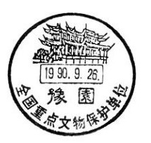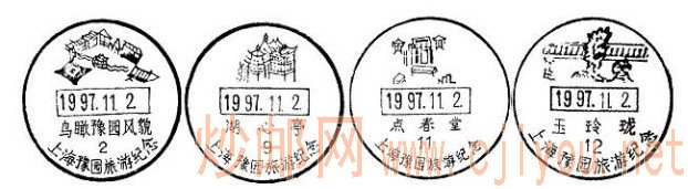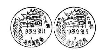 2.豫园 位于黄浦区,由三穗堂、万花楼、点春堂、会景楼、玉华堂、内园等景区的48处景点构成。为上海五大园林之一,全国重点文物保护单位。现九曲桥邮政所使用的风景日戳于1989年9月28日启用;1997年11月2日上海旅游节在豫园商城举行,曾使用戳径36mm的风景日戳12种,其中直接反映豫园景点的有4种,旅游节结束后停止使用;1999年9月26日为纪念豫园建园400周年曾启用戳径40mm的“豫园”风景日戳,仅用一天。