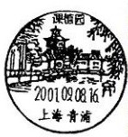 4.课植园 位于青浦区朱家角镇西井街。原园主马文卿,故俗称“马家花园”。园内建有书城,又辟有稻香村,园名“课植”乃寓“课读之余,不忘耕植”之意。庄园由厅堂区、假山区、园林区三大部分构成。风景日戳于2001年9月8日为配合《朱家角放生桥》邮资片发行而启用,现由朱家角镇新风邮政所使用。