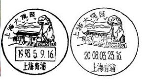 3.大观园 位于青浦区淀山湖畔,占地137.9多万平方米,分东、西两部。西部是国内首座按《红楼梦》描述的意境建造的海派寻梦乐园,占地9万平方米,建筑面积约8000平方米。有皇家苑圃气派和江南园林秀丽风格。风景日戳于1993年5月9日启用,后因戳具遗失,2008年重刻新戳,戳图未变,但按规范已不设日期框。