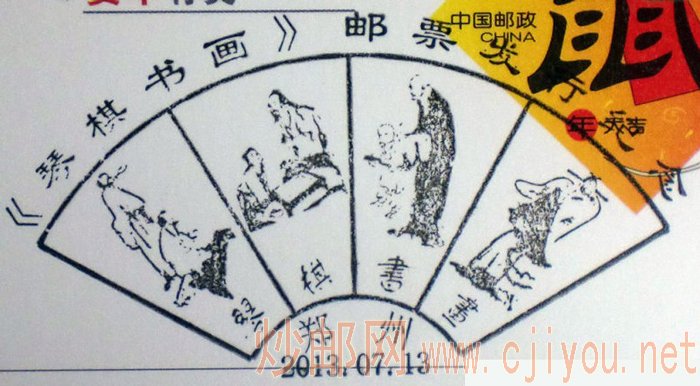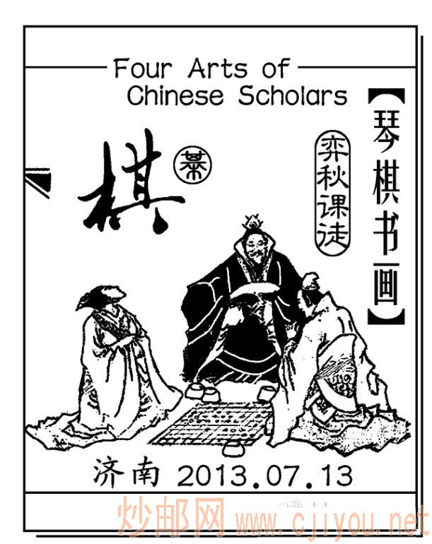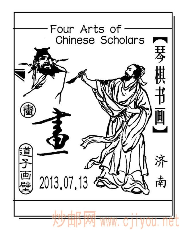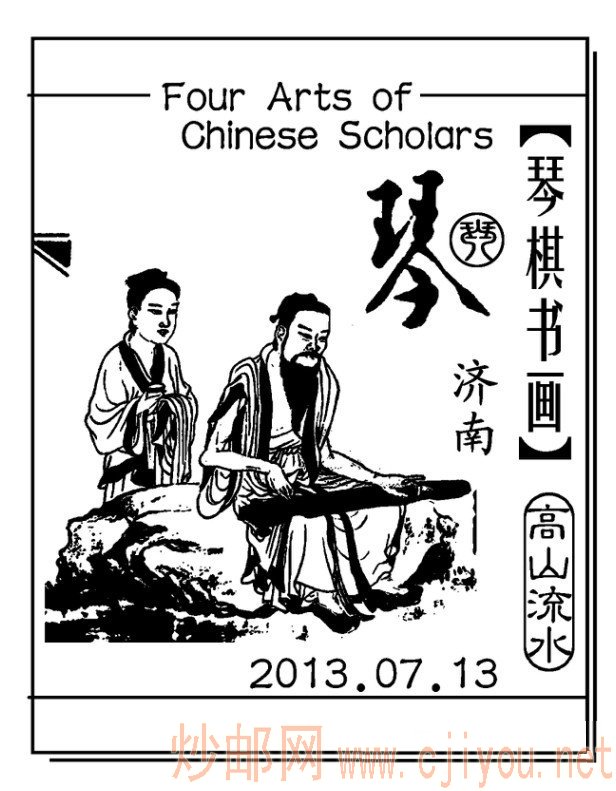 中国邮政即将于7月13日发行《琴棋书画》特种邮票,全套邮票4枚,毎枚邮票面值均为1.20元。邮票图名分别为高山流水、弈秋课徒、怀素临池、道子画壁,邮票展现历史上俞伯牙与钟子期抚琴、弈秋授艺、怀素蕉叶练书、画圣吴道子绘钟馗的画面,点明了主题,也间接表现了中国传统文化的悠久历史和深刻内涵。邮票将发行两种版式,版式一整版16枚,规格166×220毫米;版式二整版8枚共两套,规格156×150毫米。邮票将采用胶印,由北京邮票厂印制。