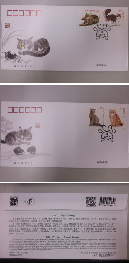 2013年8月18日中国邮政将发行《猫》特种邮票一套4枚,全套面值4.80元。邮票规格34毫米×40毫米,特约丹麦邮票雕刻师马丁·莫克设计,北京邮票厂雕刻胶印混合版印刷。邮票选用了中国的狸花猫、缅因猫和国外的阿比西尼亚猫、异国短毛猫。这套邮票采用雕刻版印刷,使猫绒绒的毛和胡须更加立体逼真,可爱的猫咪、美妙的姿态配以柔和的底色、醒目的邮票铭记,非常惹人喜爱。