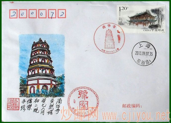 上图为南华寺的手绘封,封上贴了一枚2013-22(4-4)南华寺·祖殿邮票,用上海“南华寺”新邮纪念戳盖销邮票,从上海张杨路邮局寄出,封上留有一枚上海“豫园”新邮纪念戳。