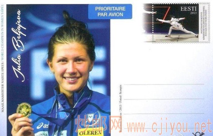 爱沙尼亚为世界击剑冠军发行邮资明信片 日期:2013-09-28 来源:新浪博客 贝贾杰娃出人意料获得女子重剑冠军 在匈牙利布达佩斯举行的2013年击剑世界锦标赛上 ,爱沙尼亚选手发挥出色,包揽两金。其中世界排名第69位的贝贾杰娃出人意料获得女子重剑冠军,诺沃斯约洛则获得男子重剑冠军,这是他继10年巴黎世锦赛夺冠后,第二次获得该项目个人赛世锦赛冠军。 爱沙尼亚邮政于9月25日发行的邮资明信片。