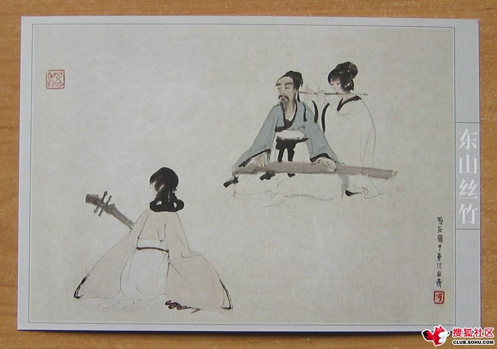 傅抱石此画表面上是描述东晋隐士谢安与一些名士的生活画面,其意蕴深邃。中国有句成语;东山再起!就是因谢安而产生的。后来谢安官至极品,位列一人之下万人之上。东山再起因此而成为中华民族,生生不息的精神支柱。2004年6月,文化部向国家邮政局致函《关于建议发行"傅抱石诞生100周年"纪念邮资明信片》,7月,江苏省邮政局邮资票品局丁蕾接到设计任务,10月5日,TP28《傅抱石作品--东山丝竹》发行。从TP28《傅抱石作品——东山丝竹》开始,在印刷中使用了防伪油墨和微缩文字的防伪方式,无疑中给TP邮资片注入了前所没有的科技含量,可以说自邮资片中TP28傅抱石是新中国第一枚科技含量高,防伪性能强的邮资片。